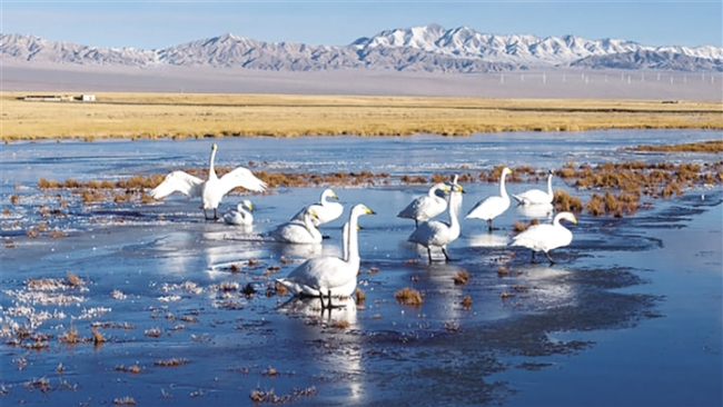 近期,阿克塞县小苏干湖湿地逐渐进入封冻期。在尚未完全结冰的水域,成群的大天鹅游弋觅食。它们洁白的身姿与澄澈的冰湖、金黄的草原及远处皑皑雪山相映成趣,构成动人的冬日湿地生态画卷。