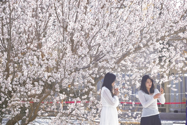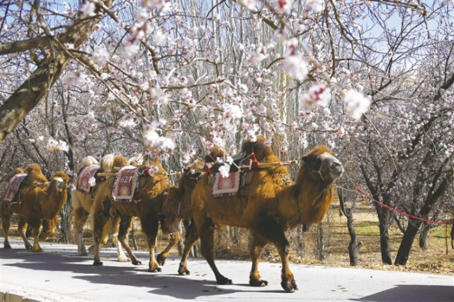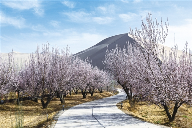 近日,位于鸣沙山下的敦煌市月牙泉镇千亩李广杏花次第绽放、宛如云霞、芬芳迷人。